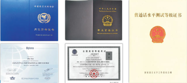 可根据所学专业,参加相关部门或行业组织的考试,成绩合格,可取得相应的职业资格证书,如公共英语三级、普通话等级证书、安检证书、民航客运证、急救证、海员证书、礼仪证书、茶艺证书、民航客舱乘务员培训合格证等。